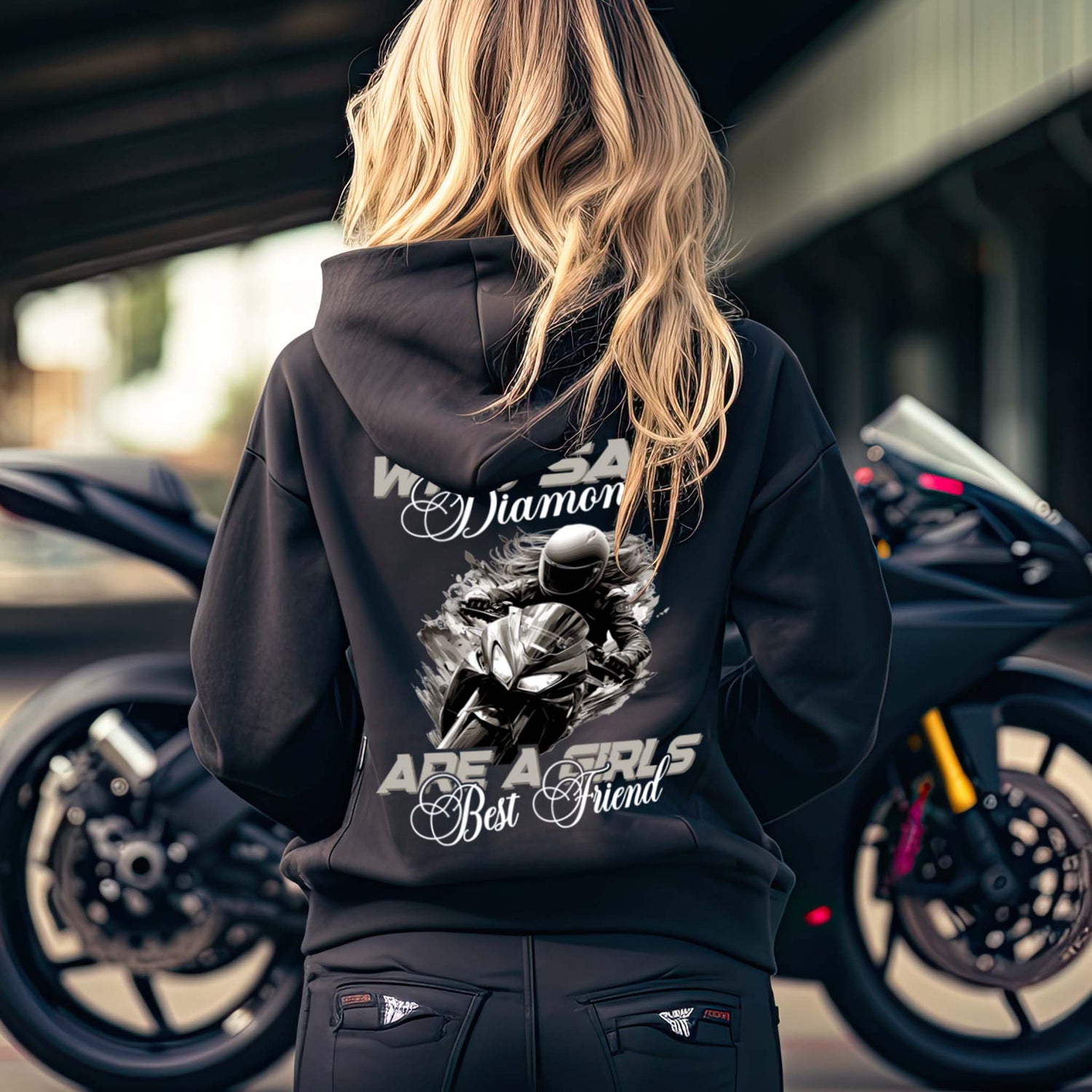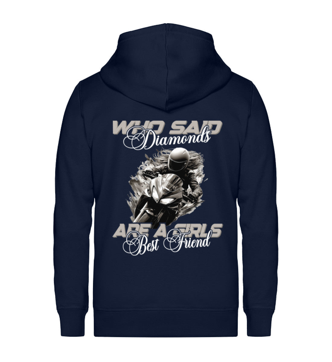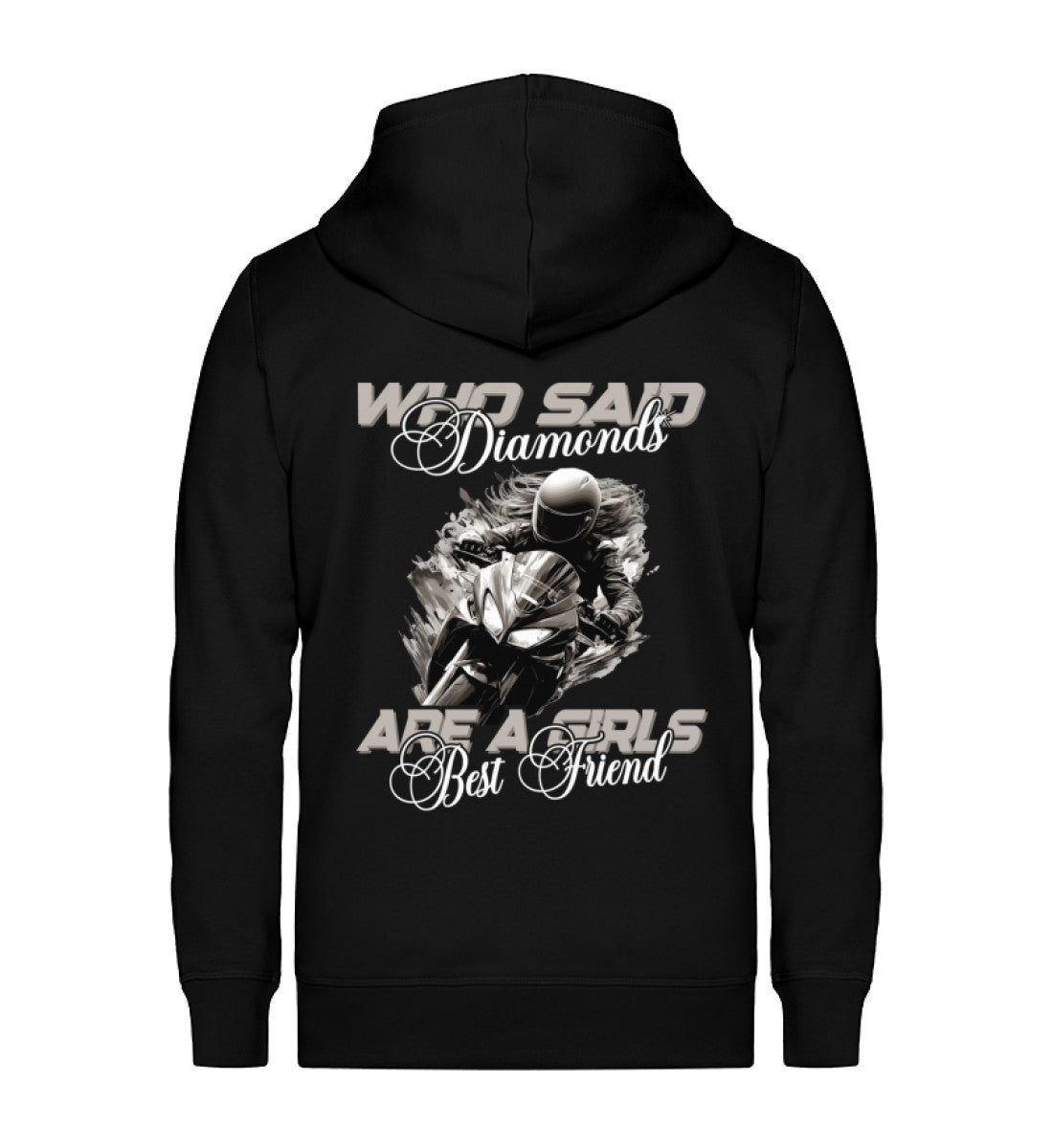 Jede Frau, die eine Supersportler fährt, weiß, dass die wahren Juwelen Adrenalin und Asphalt sind. Diese Hoodie-Jacke ist für dich – für die Bikerin, die weiß, dass ihre Leidenschaft zum Motorradfahren sie am Brennen hält. Hier zählen keine Karat, sondern Pferdestärken.