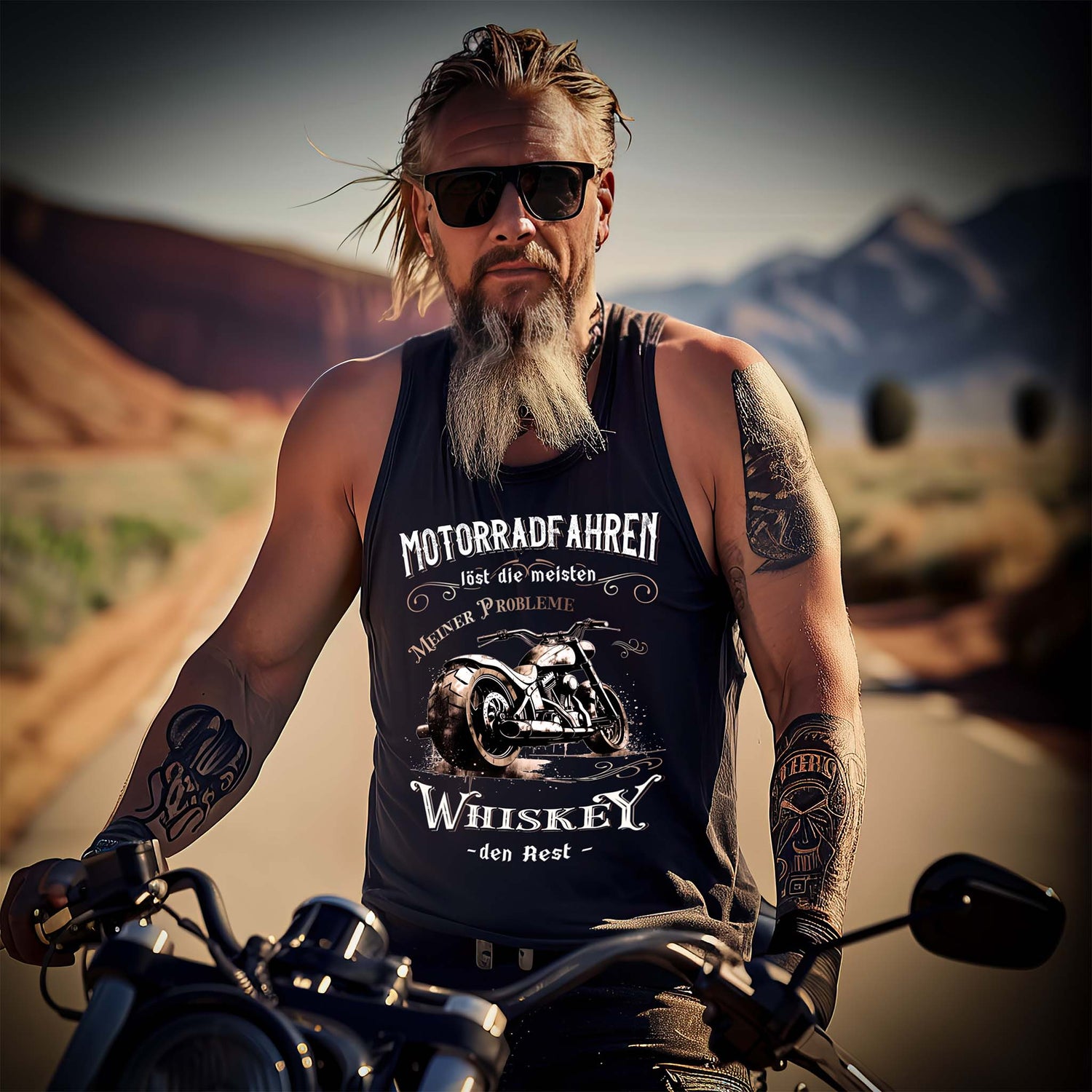 Für alle Biker, die auf zwei Rädern dem Alltag entkommen und wissen, dass nach der Tour nur noch eines fehlt: ein guter Whiskey. Dieses Tanktop ist für Biker, die ihre Freiheit leben und mit Gelassenheit genau das tun, was sie lieben.