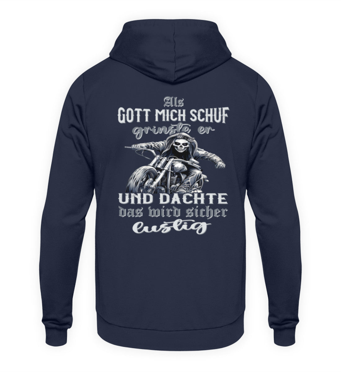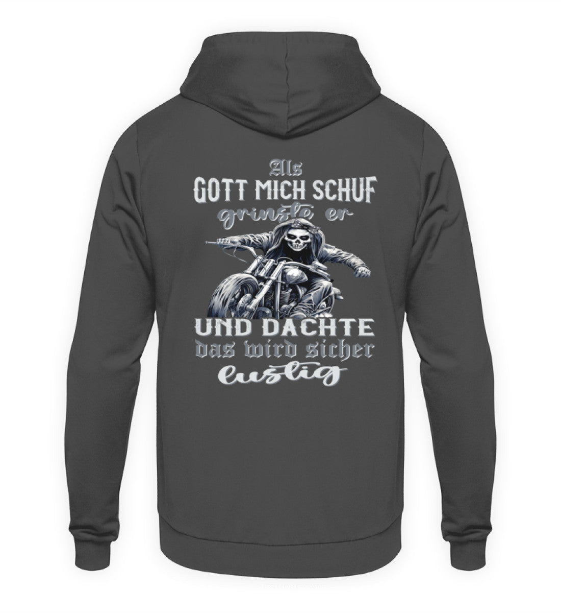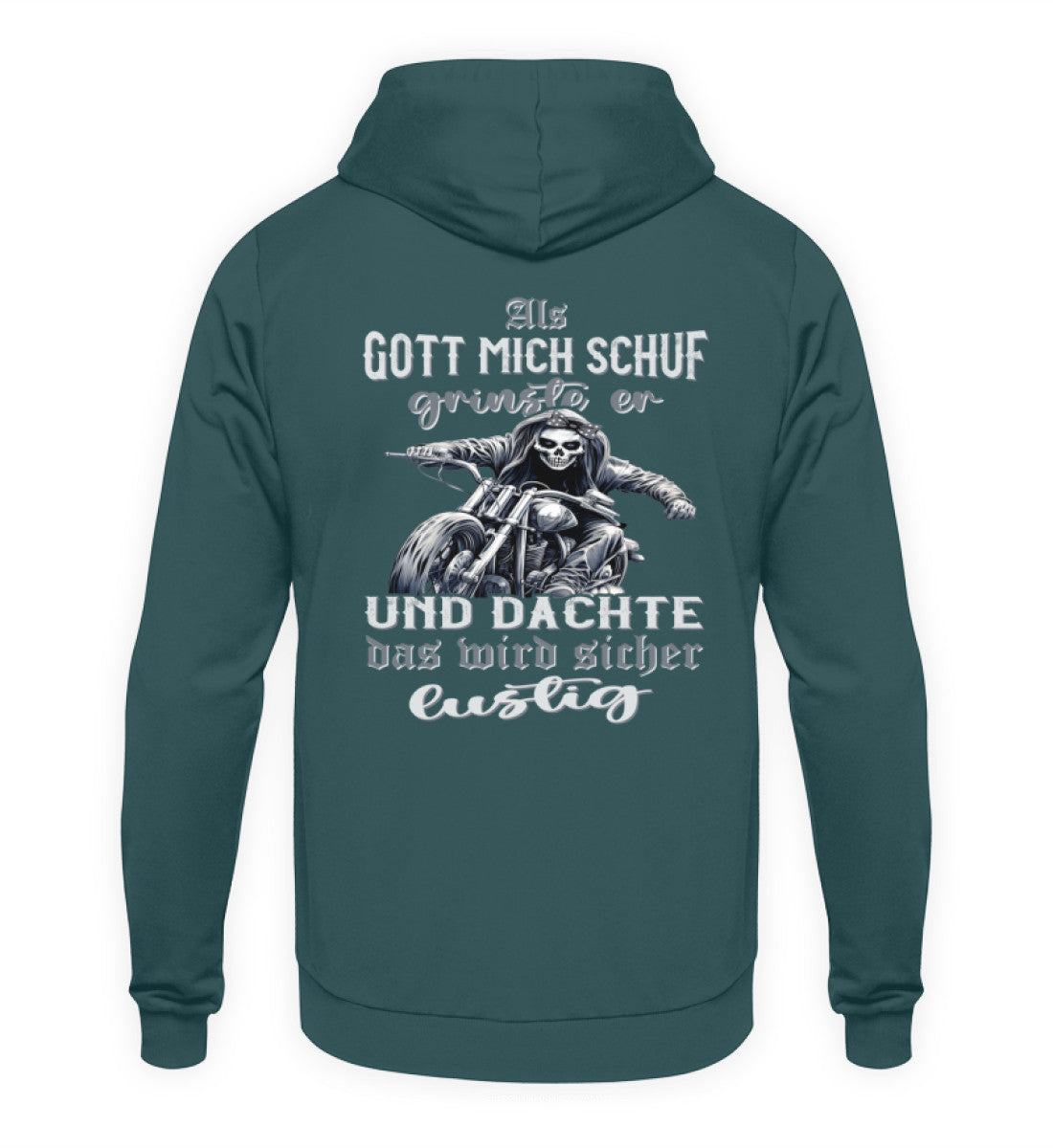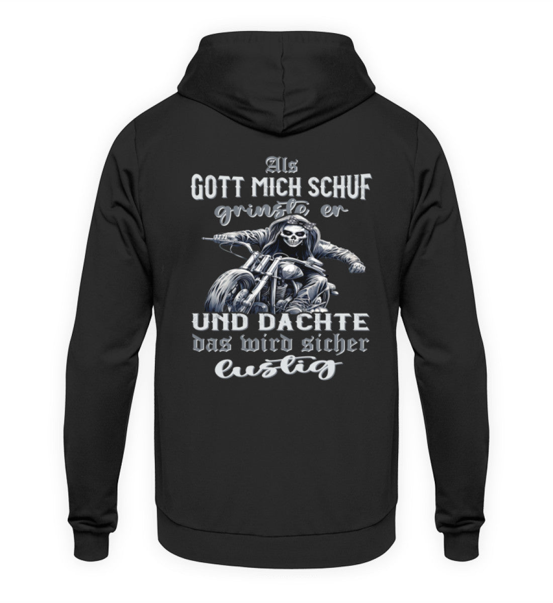 Als Gott mich schuf grinste er und dachte, das wird sicher lustig! - Motorrad Hoodie mit Back Print