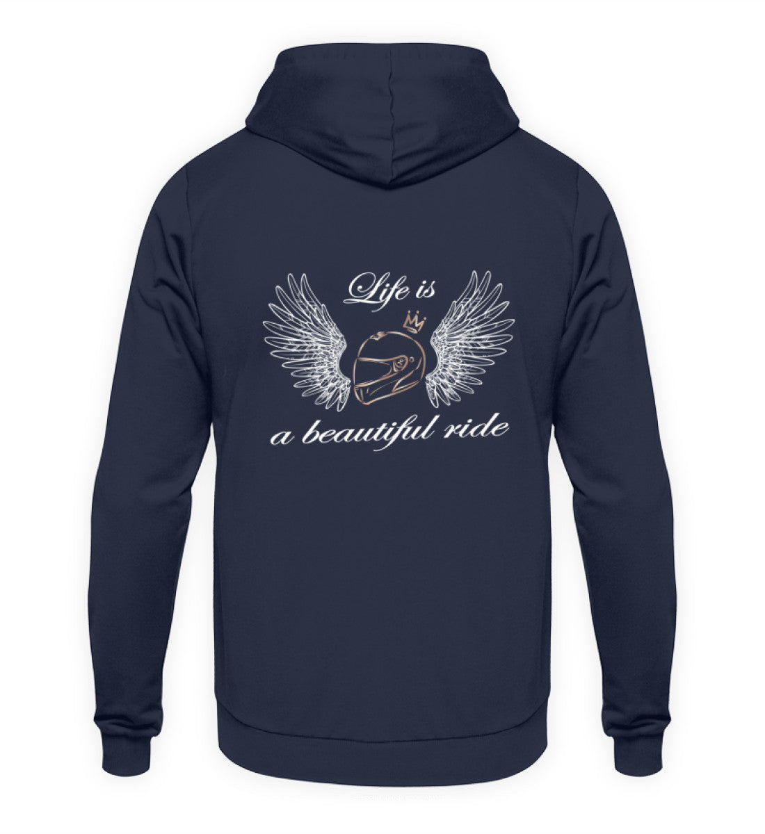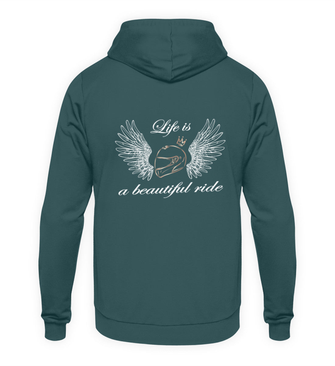 Hol dir jetzt den "Life is a Beautiful Ride" Hoodie und trage die Botschaft von Abenteuer und Freude auf deiner nächsten Tour. Lass deinen Helm mit Flügeln dich auf deiner Reise begleiten und feiere die Schönheit des Lebens auf zwei Rädern.